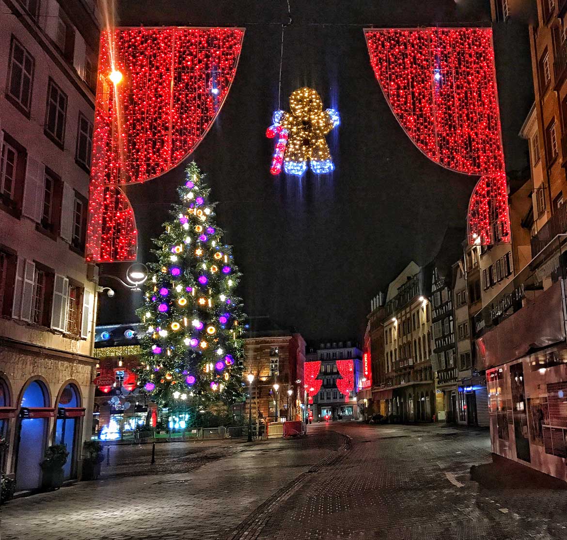 Nastavljam dalje i uviđam da su Strasburžani ozbiljno shvatili zadatak postavljanja novogodišnje dekoracije. Ukrasne mašne, zvezde, pahuljice... Krase svaki izlog i zgradu. Dominantne boje su crvena i zlatna, a oni malo maštovitiji su se odlučili i za ljubičastu, ružičastu, plavu, žutu...