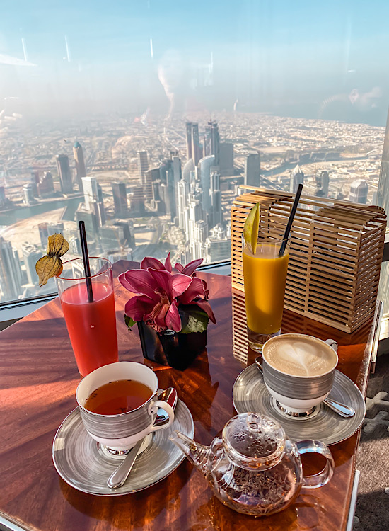 Druga opcija je poseta Atmosphere restoranu koji se nalazi na 122. spratu. Do njega stižete kroz ulaz u Armani hotel, liftom za tačno minut. Spremite se na bol u ušima. Bilo bi poželjno napraviti rezervaciju ako želite sto pored prozora, ali se nama ovaj put posrećilo i bez nje. Za sto je inače potrebno potrošiti minimum 50 evra po osobi, osim ako dodjete od 7-9 ujutru kada imaju akciju koja se zove ,,Morning coffee in the clouds”.