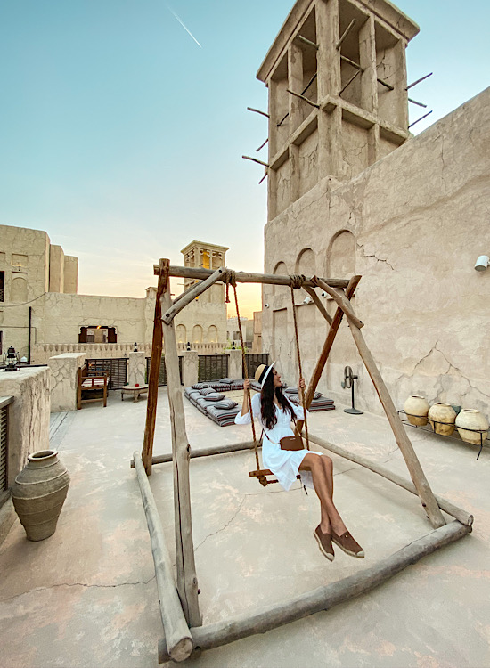 Da, sve se to vidi sa veće visine. Medjutim, na koje god stepenice da bismo krenule, svuda je bio zabranjen prolaz. Kada smo nekog radnika pitale zašto je tako, rekao nam je da je ovo deo gde su uglavnom hoteli i da negostima ulaz nije dozvoljen. Taman kada smo se pomirile da ćemo ostati okružene zidinama i biti uskraćene za neke prelepe prizore, niotkuda su se pojavile jedne uske stepenice, bez znaka STOP. Brzo smo se uspele i WOW. Ne samo da smo mogle da vidimo sve pomenuto nego je i na terasi bila ova postavka sa ljuljaškom. Toliko detalja, jastuci na zemlji, ćupovi, stari koferi. Još bolje, bile smo skroz same. Kako se spustio mrak, tako smo se i mi spustile i na izlazu smo saznale da je ovo terasa Al Seef Heritage hotela.