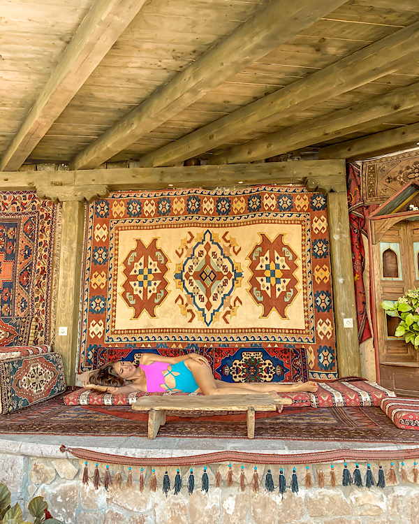 U vreme naše posete tu je bio i vlasnik, o kome sam kroz priču mogla da zaključim da je izrazito obrazovan i da nema kontinenta na svetu gde nije živeo, koji nam je rekao da je ovo mesto postalo ,,instaraj” pre oko 2 godine, kada su ta posetili neki poznati ruski i kineski blogeri i postavili fotografije na društvene mreže. Vlasnik je dugo dozvoljavao besplatno fotografisanje, jer je mislio da će to privući potencijalne kupce, medjutim počeli su da se stvaraju redovi ljudi koji tepihe nisu ni na trenutak pogledali. Tada je uveo ,,taksu” za fotografisanje, koja iznosi 50 lira kada se koristi telefon, a 250 ako ovde dodjete sa profeisonalnim fotoaparatom. Vreme fotografisanja je ograničeno na 20-30 minuta, ali smo mi sada bile jedine, pa smo mogle na miru i da popijemo čaj i lepo se ispričamo sa vlasnikom i zaposlenima. Jedan momak koji ovde radi mi je i pomogao da dobijem fotku od gore jer se popeo na balkon iznad prodavnice.