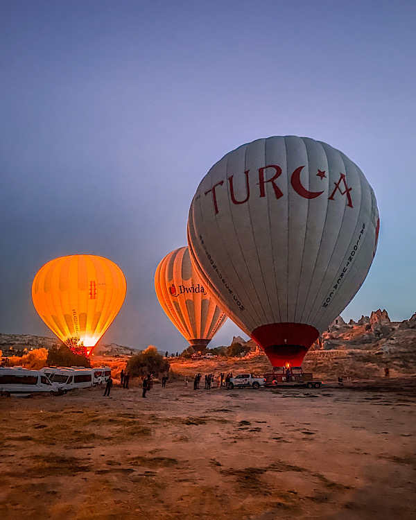 Baloni kreću sa različitih lokacija, malo pre zvaničnog vremena izlaska sunca. U ovom periodu je to oko 6 ujutru, što znači da su nas iz hotela kupili izmedju 4:30 i 5. Iako je napolju bilo jako hladno (dobro se obucite čak iako je dnevna temperatura preko 30 stepeni), tokom samog leta je bilo vrlo prijatno zbog vatre koja se pali na svakih par minuta da bi se održala dovoljna količina toplog vazduha koji omogućava letenje balona.