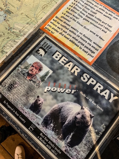 Ključ od jedinog smeštaja (Range Riders Lodge) koji smo našli na airbnb-u nam je ostavljen u prodavnici gde nas je na kasi dočekala reklama za sprej protiv medveda.