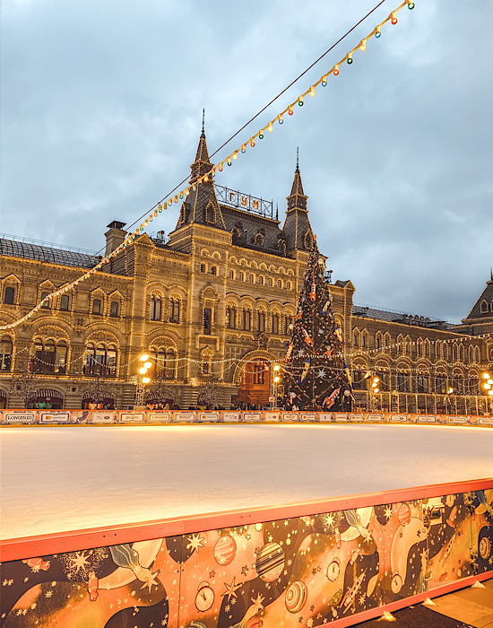 Sa klizališta se, osim GUM-a, vidi i Istorijski muzej, Lenjinov muzej i grobnica, kao i veličanstveni Hram Vasilija Blaženog.