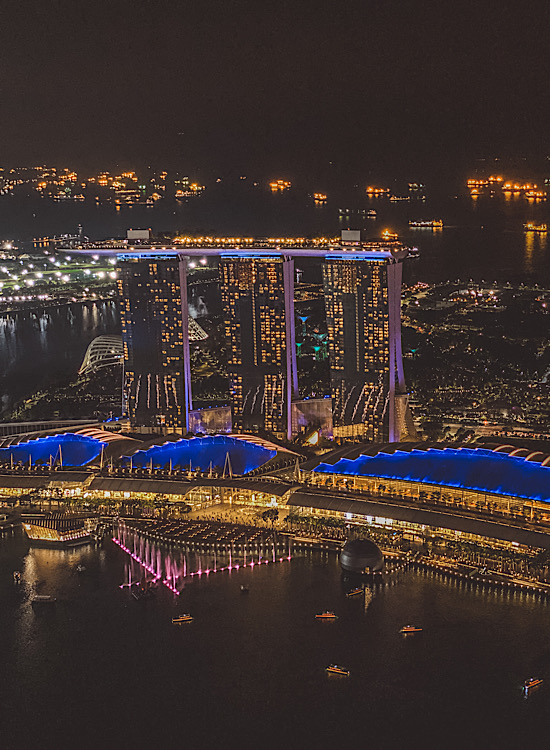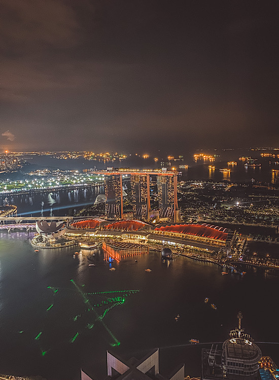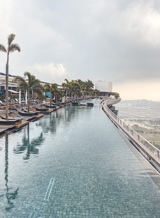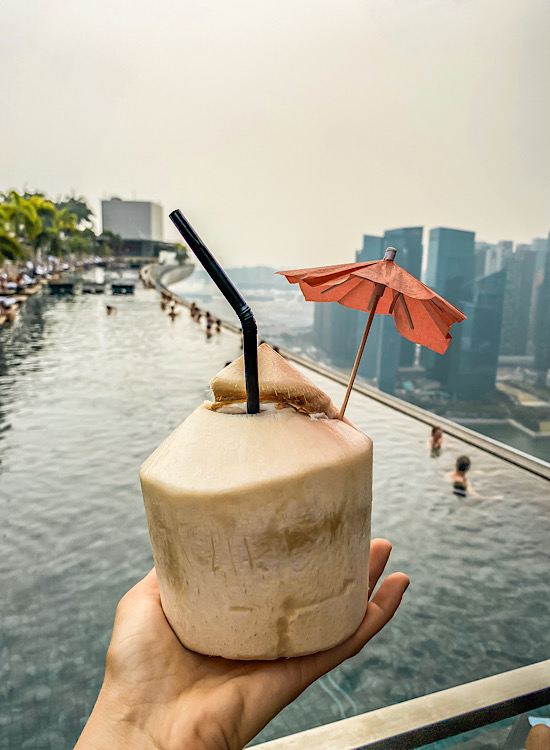 Pre dolaska sam dugo razmišljala da makar jednu noć provedem u Marina Bay Sands hotelu, ali mi se cena od oko 450 evra ipak nije uklopila u budžet. Srećom, našla sam način da poznati infinity bazen vidim za tek oko 15 evra. Bar/restoran Celavi se nalazi na 57. spratu iste zgrade, odmah do bazena. Za pogled na bazen idite u lounge, ne u bar. Na ulazu platite 22 SGD, ali ih možete potrošiti na hranu ili piće. Toliko otprilike košta jedan koktel. Nisam zažalila što nisam noćila u ovom hotelu jer je vreme bilo baš bezveze, a pogled zbog oblaka ne tako sjajan. Kiša me je brzo oterala unutra.