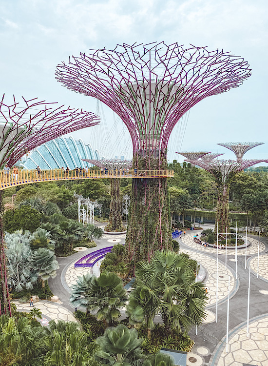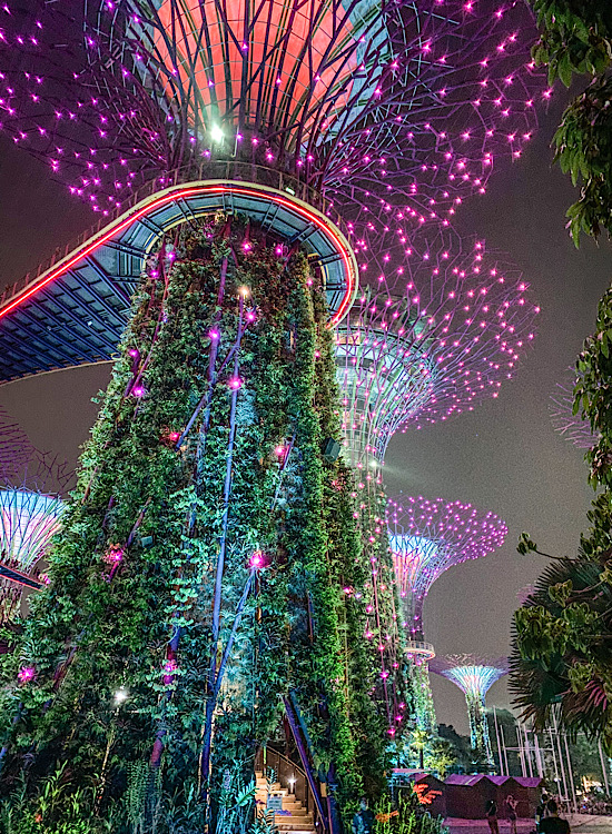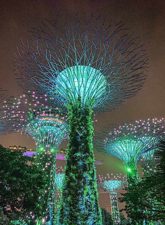 Park ,,Gardens by the bay” je ogromna zelena površina u sred Singapura, izgrađen sa zamišlju da bude simbol grada kog zovu baštom Azije. Ideja je uspela i danas ga godišnje poseti skoro 10 miliona ljudi. Najviše se svi oduševe super drvećima (baš tako se zovu-,,Supertrees”) koja su visine od 25 do 50 m. Uživo mi ne izgledaju toliko ogromno kao što sam ih zamišljala. Ukupno ih je 18, 12 u centralnom delu i po 3 u zlatnoj i srebrnoj bašti u blizini. Noćna šetnja je obavezna. Pogotovo ako se ovde nađete u 19:45 i 20:45, kada drveća propevaju i počnu da menjaju boje.