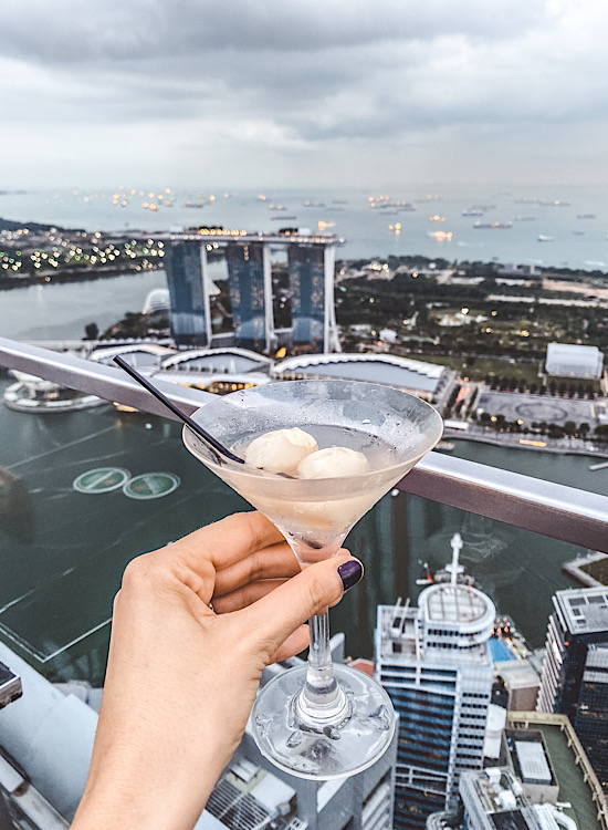 U potrazi za najboljim pogledom na Singapur, naišla sam na preporuke za Altitude bar. Nalazi se na 63. spratu zgrade ,,One Raffles place”. Na samom ulazu u zgradu će vas sačekati hostesa i da biste pristupili liftu moraćete da platite 35 SGD, a za tu cenu posle na vrhu dobijete 2 pića. Nije mi se dopalo što tu gde plaćate morate odmah da kažete šta želite da pijete. Pošto sam planirala i da večeram, htela sam da izaberem piće koje će ići uz jelo, ali nisam mogla. Izabrala sam liči martini (liči je vrsta ljigavog slatkastog voća) i neki njihov specijalni ,,sunset” koktel. Ovaj martini je definitivno bio pun pogodak, skoro nisam pila ukusnije piće.